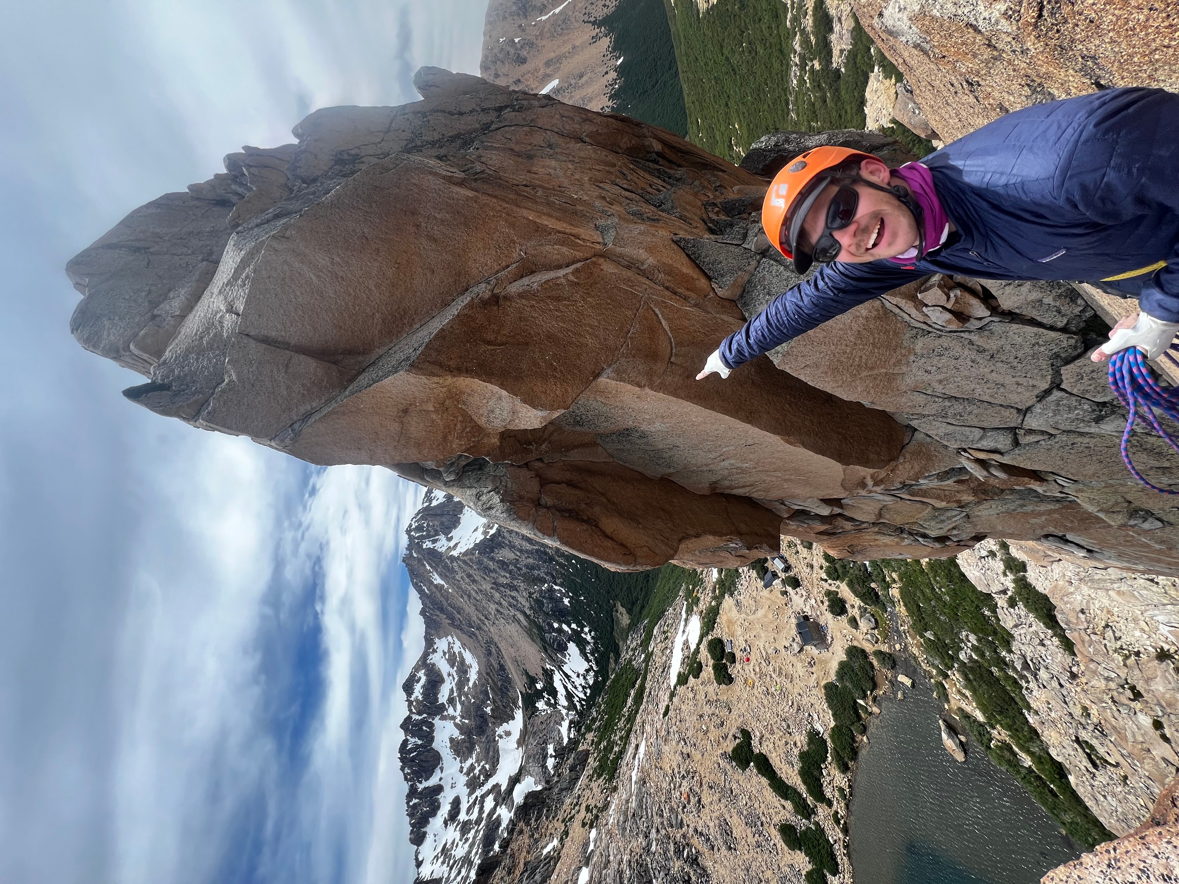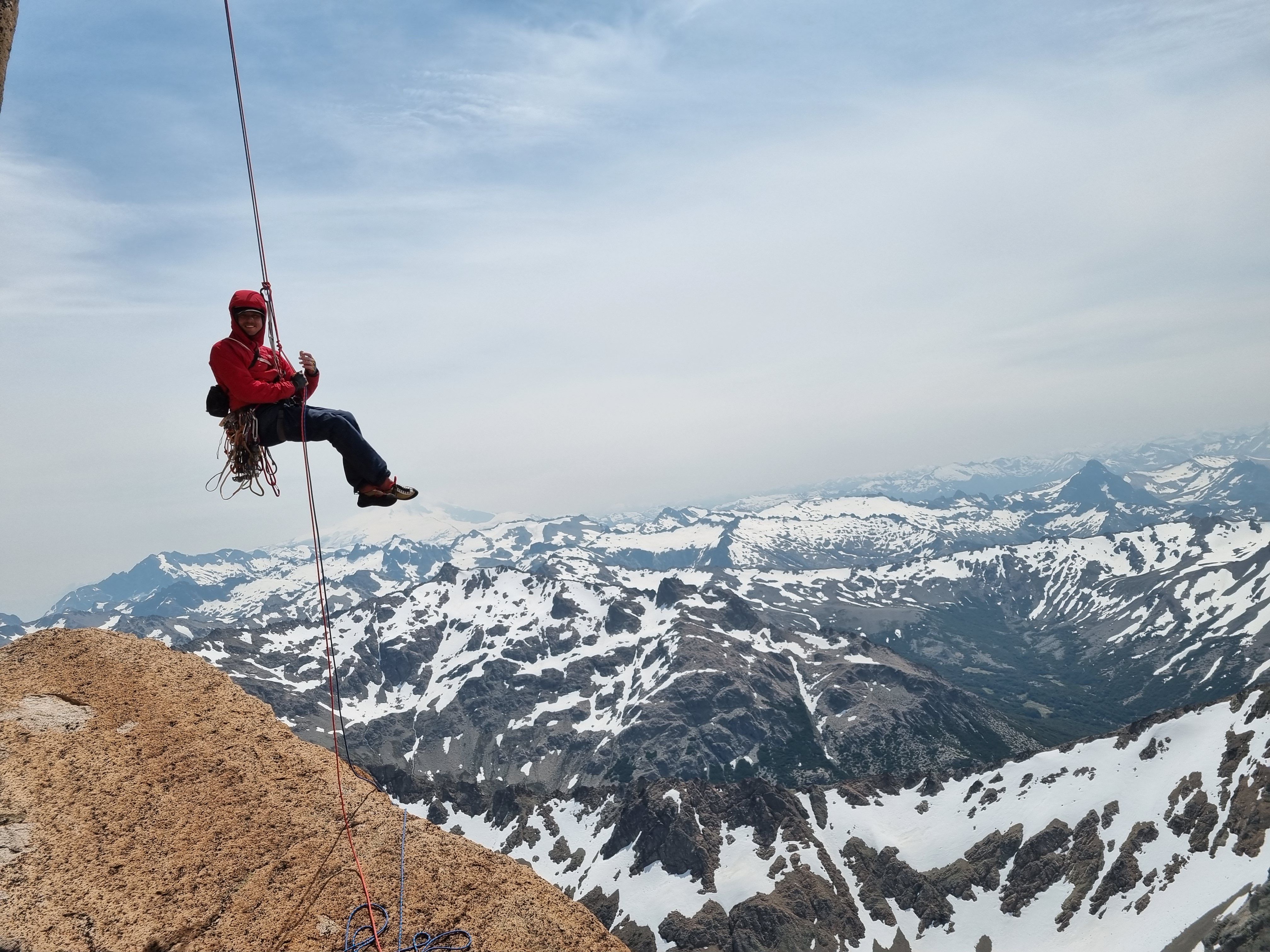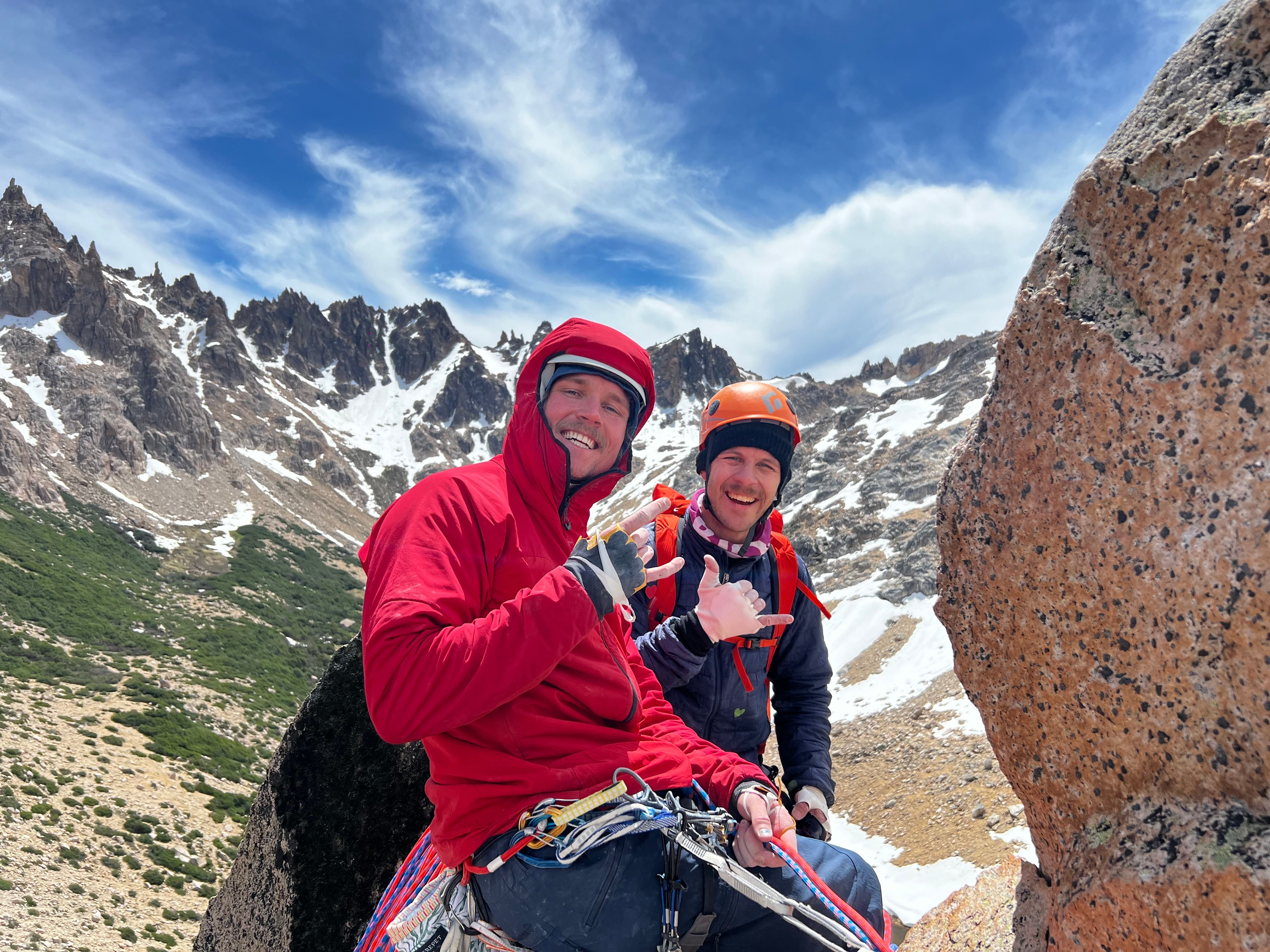 I dag skal det stĂžtes! Sondre fikk bruke hele dagen i gĂ„r pĂ„ Ă„ titte opp pĂ„ Aguja Frey og sĂ„ mye pĂ„ linja som fikk rett opp, Sifuentes-Monti ruta. Viten om nye matlager har gitt oss stĂžteenergi, og vi simul-klatrer opp til standplassen under cruxtaulengden. PĂ„ stand mĂžter jeg noen lokale som forklarer meg at den er “Bastante dura por seis b” - veldig hardt for 6b. Jeg vil ikke Ăždelegge psyken til Sondre, sĂ„ jeg lar ham gĂ„ pĂ„. Han leder i god stil opp til bolten ved cruxet, og gir det et skikkelig stĂžt, fĂžr han faller av. Etter et kvarters jobbing spĂžr han om jeg vil overta. Jeg var litt skeptisk, men guidebokas lovnad om lettere terreng etter cruxet overbeviser meg. Etter to fall pĂ„ bolten gĂ„r det endelig - men det lettere terrenget etterpĂ„ er en underdrivelse. Jeg kjemper meg opp til stand, og nĂ„r vi endelig nĂ„r toppen er vi enige om at vi venter med mer klatring til imorgen, nĂ„r vi skal pĂ„ den store juleturen.