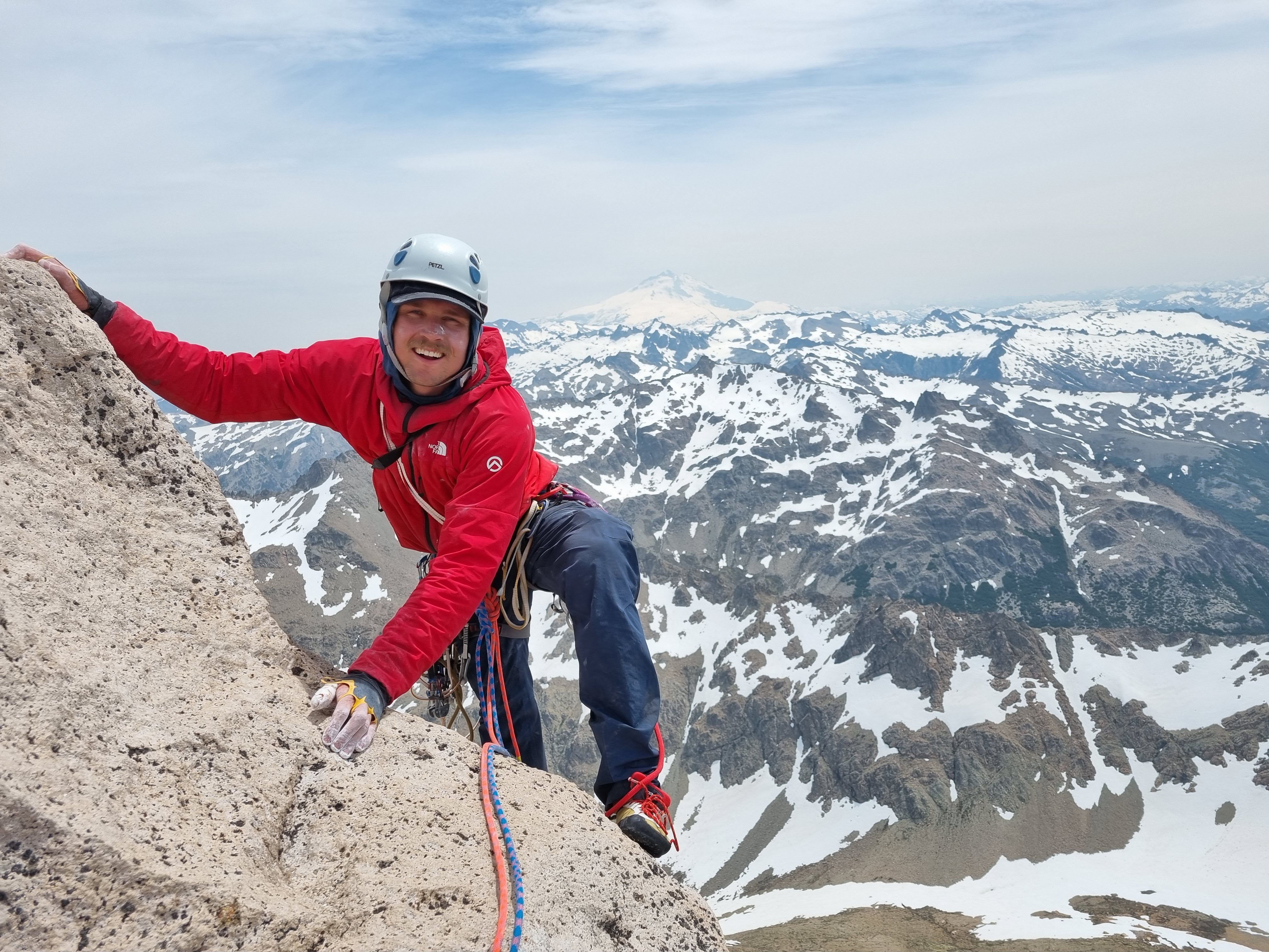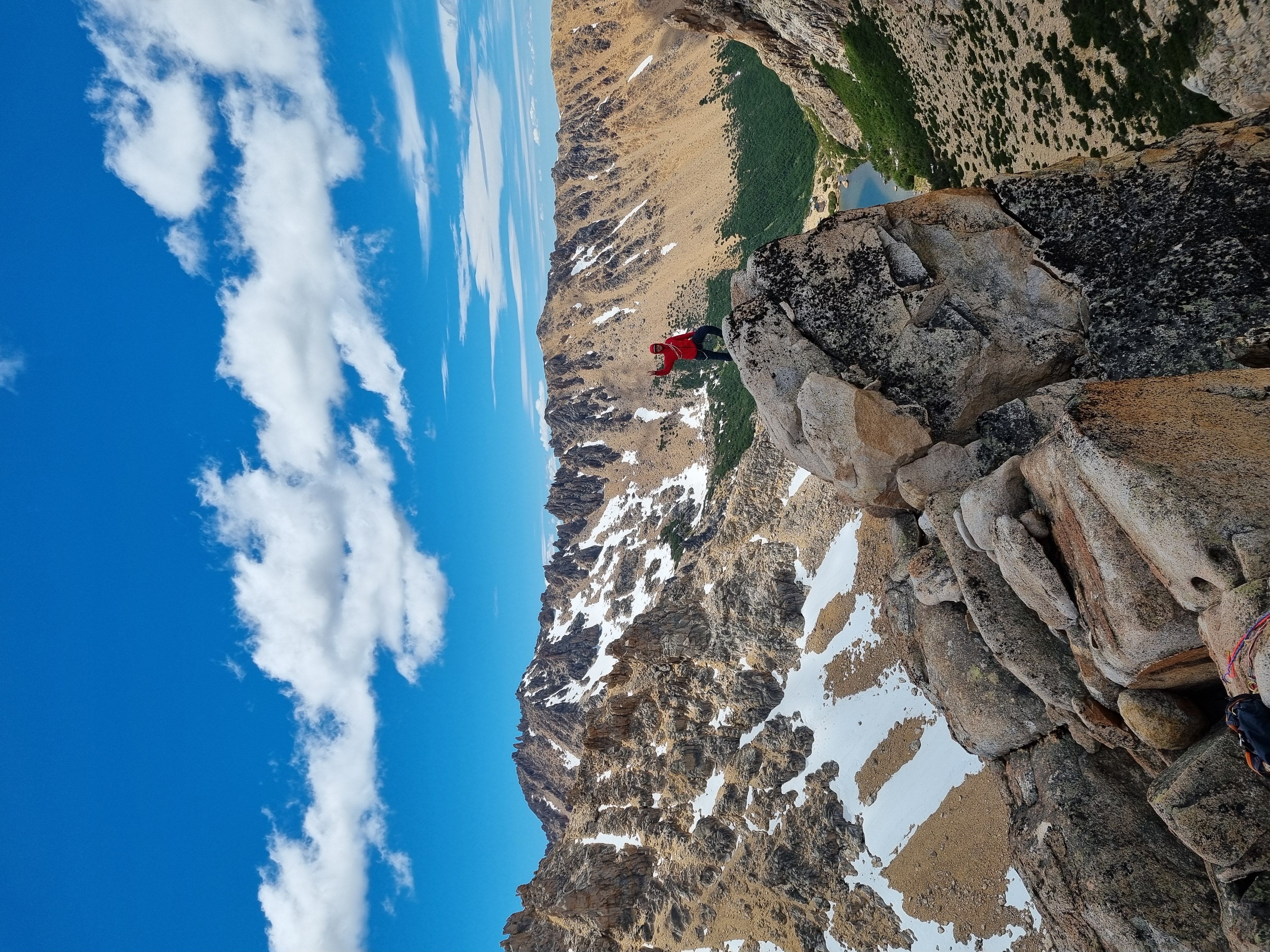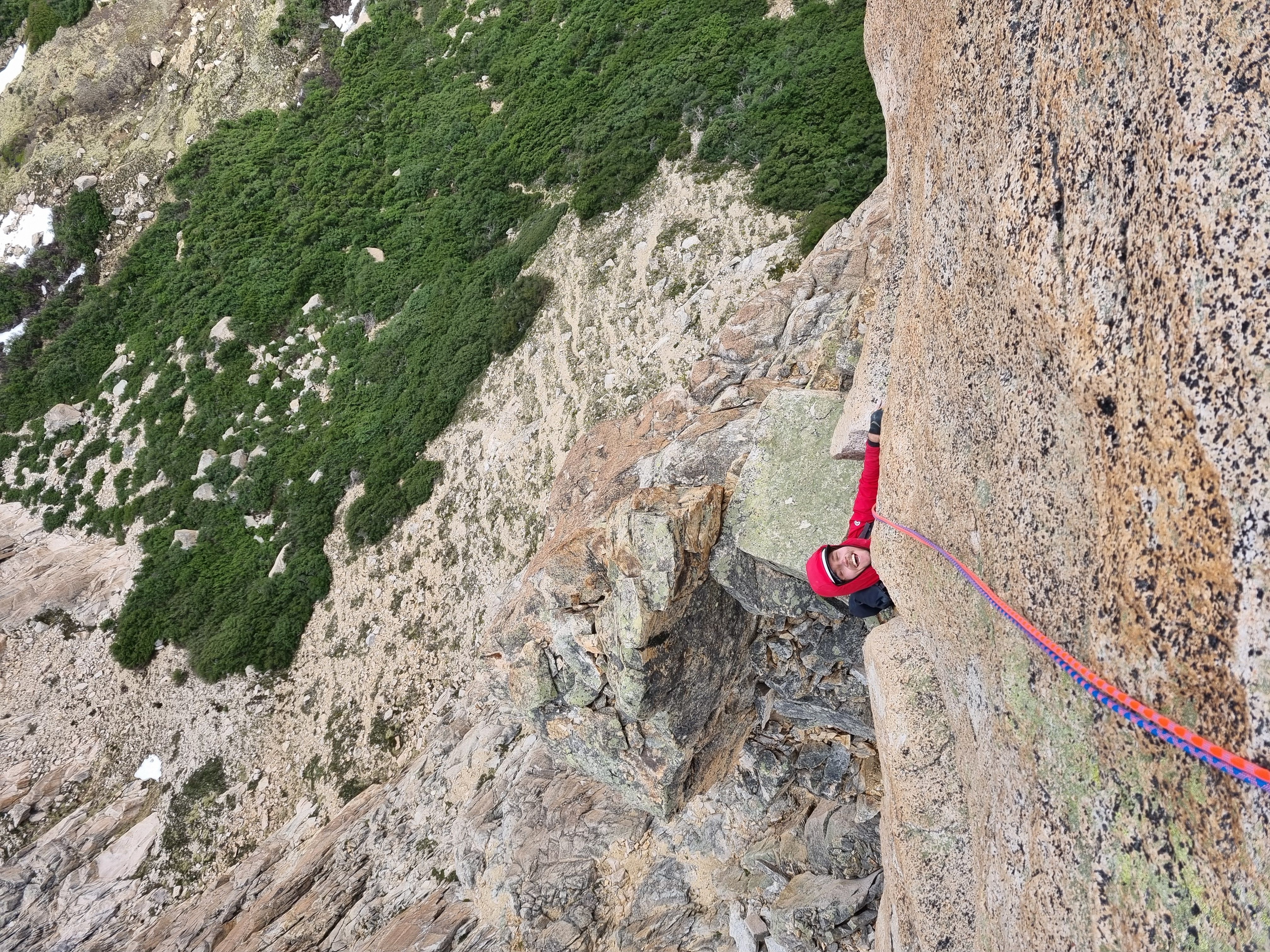 I dag skal det stĂžtes! Sondre fikk bruke hele dagen i gĂ„r pĂ„ Ă„ titte opp pĂ„ Aguja Frey og sĂ„ mye pĂ„ linja som fikk rett opp, Sifuentes-Monti ruta. Viten om nye matlager har gitt oss stĂžteenergi, og vi simul-klatrer opp til standplassen under cruxtaulengden. PĂ„ stand mĂžter jeg noen lokale som forklarer meg at den er “Bastante dura por seis b” - veldig hardt for 6b. Jeg vil ikke Ăždelegge psyken til Sondre, sĂ„ jeg lar ham gĂ„ pĂ„. Han leder i god stil opp til bolten ved cruxet, og gir det et skikkelig stĂžt, fĂžr han faller av. Etter et kvarters jobbing spĂžr han om jeg vil overta. Jeg var litt skeptisk, men guidebokas lovnad om lettere terreng etter cruxet overbeviser meg. Etter to fall pĂ„ bolten gĂ„r det endelig - men det lettere terrenget etterpĂ„ er en underdrivelse. Jeg kjemper meg opp til stand, og nĂ„r vi endelig nĂ„r toppen er vi enige om at vi venter med mer klatring til imorgen, nĂ„r vi skal pĂ„ den store juleturen.