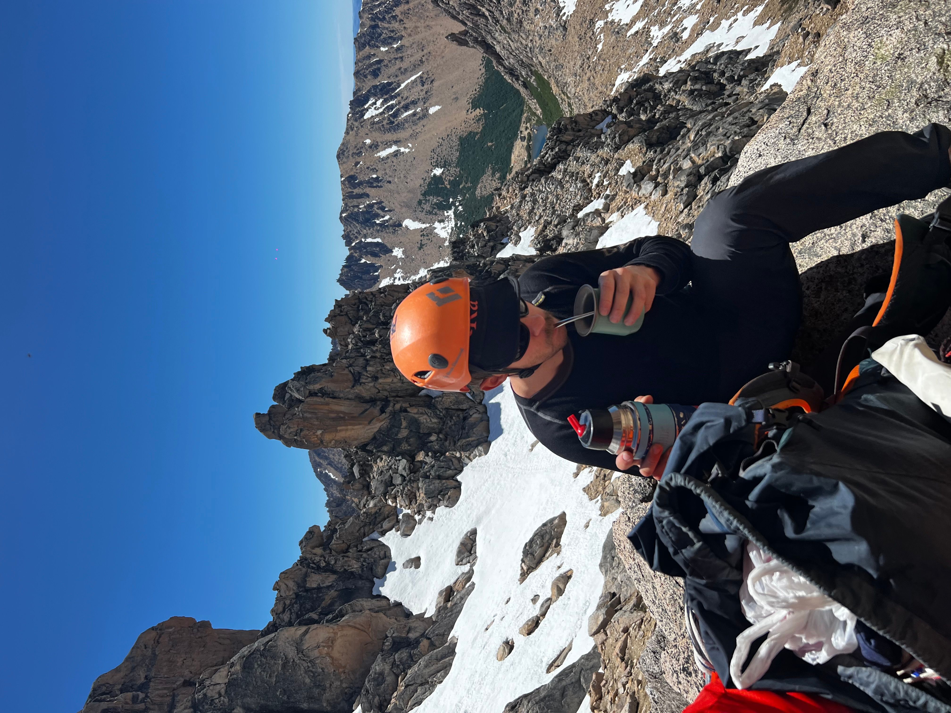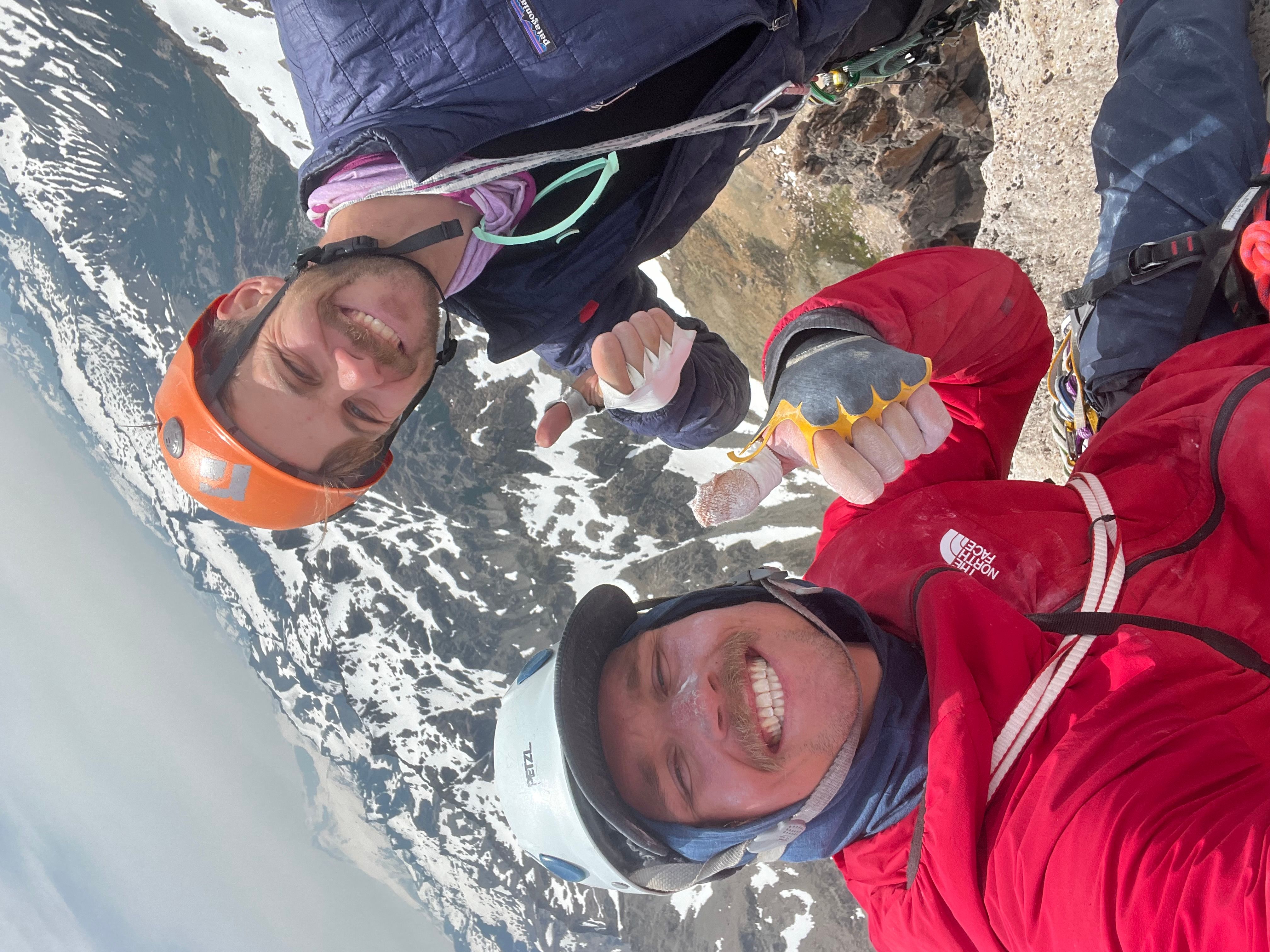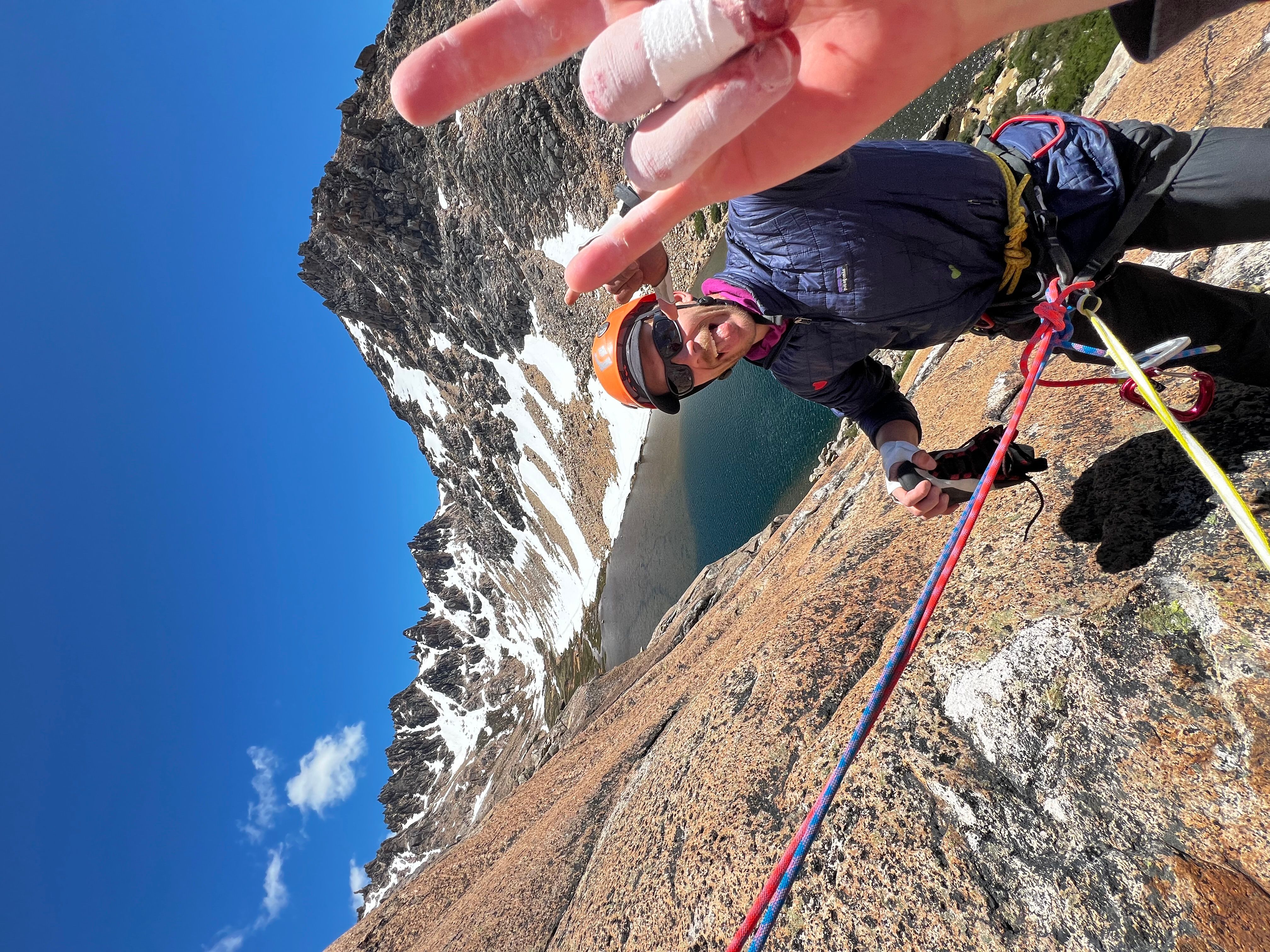Det er nÄ tre dager siden Sondre fikk halvdelen av tommelen revet av. Idag vil han tilbake og fÄ revansj pÄ toppen, med tommelen i bandasje. For sikkerhets skyld starter vi fra camp allerede kl 07, for Ä ha god tid. NÄr vi stÄr ved innsteget starter Sondre med Ä lede de fÞrste taulengdene, med tommelen i bandasje! Vi nÄr toppen som dagens fÞrste, og rekker Ä fjase rundt en stund fÞr vi rappellerer ned.