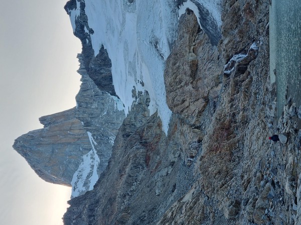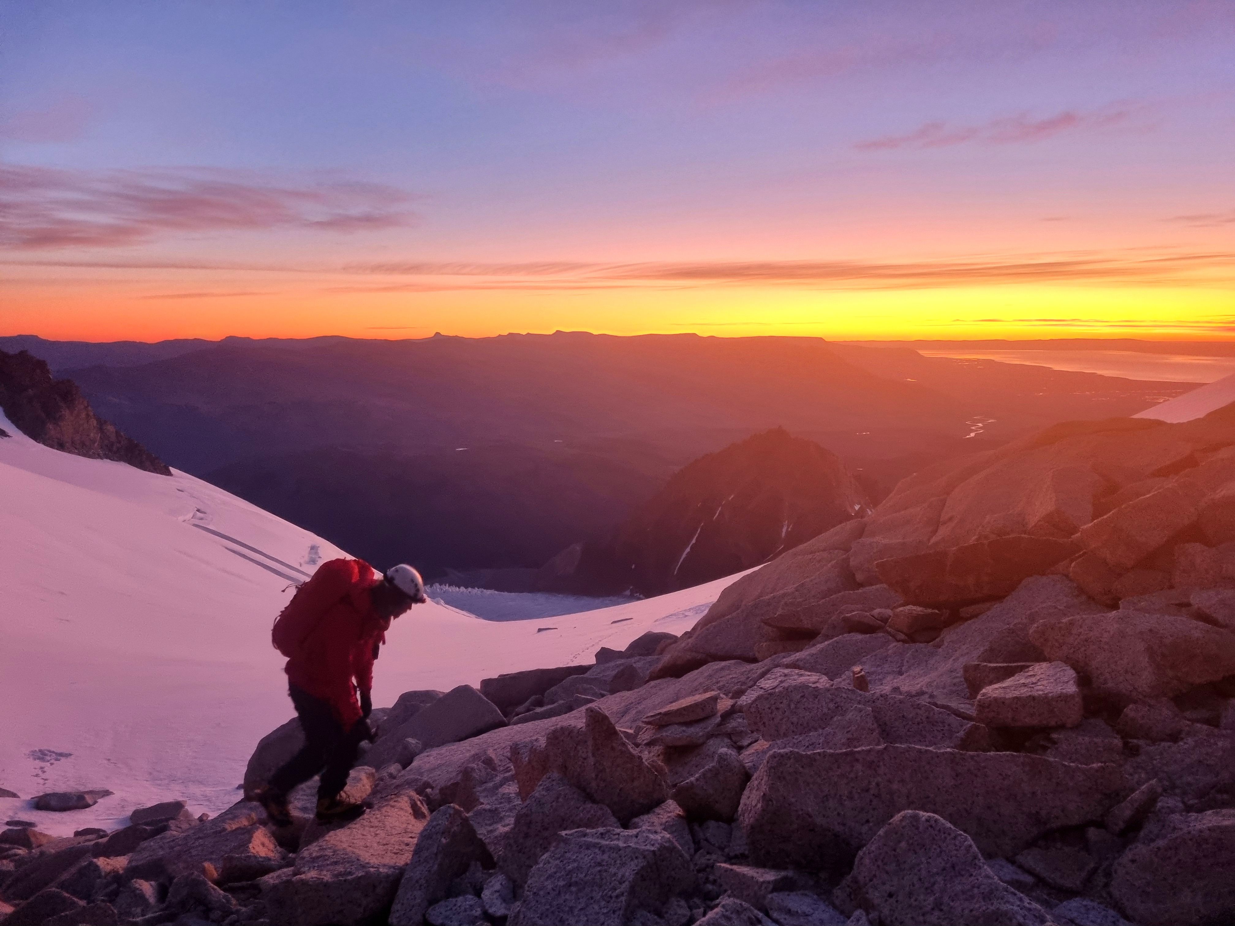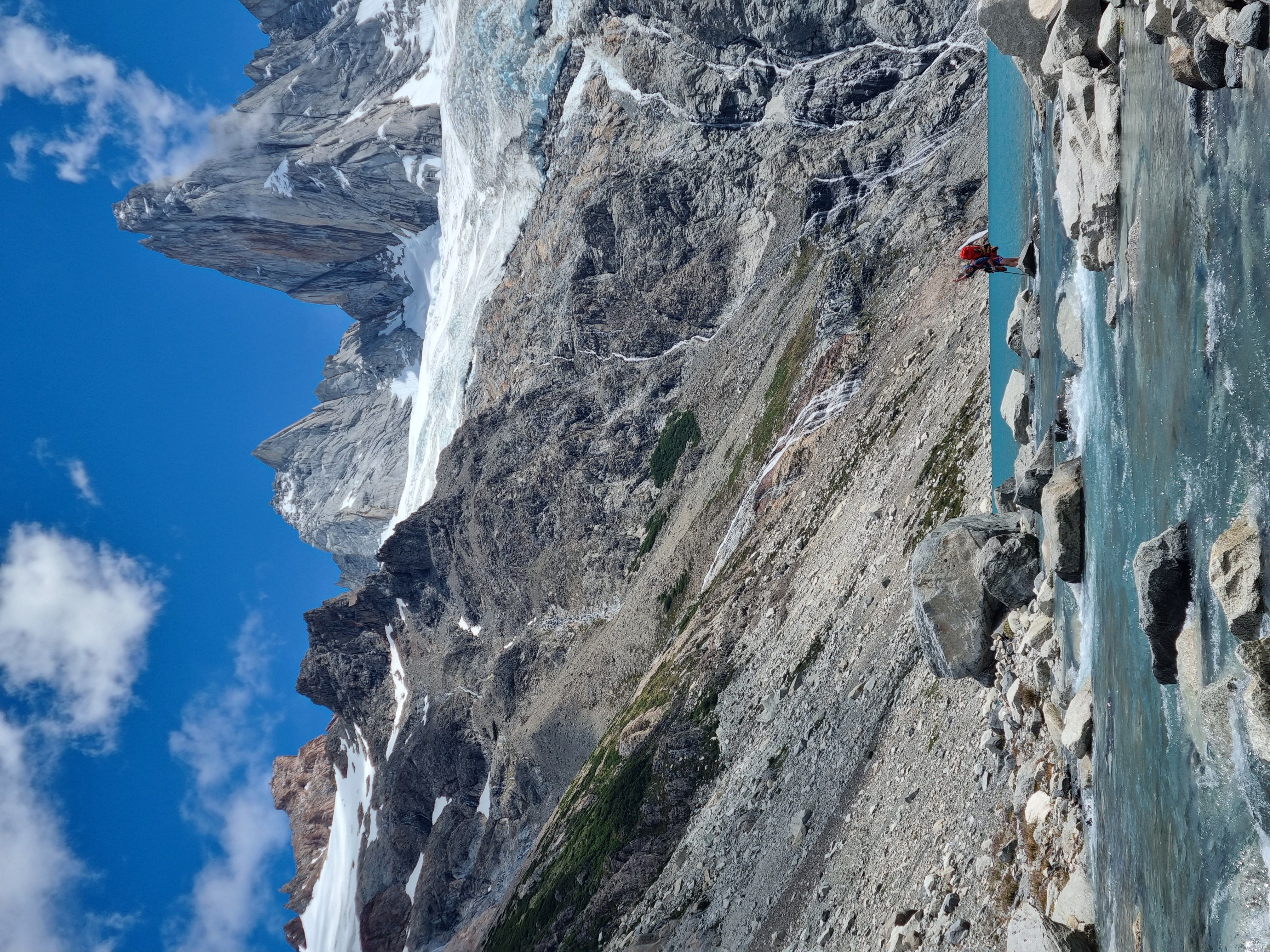 PÄ vei ned mÞter vi australerne, som har snudd ved snÞfeltet, og slÄr fÞlge tilbake over breen. Idet vi stÄr pÄ brekanten kommer det et stort steinsprang, og vi mÄ hoppe unna for Ä unngÄ Ä bli truffet. Lettere rystet kommer vi trygt ned pÄ andre siden av breen og ned i camp. Jeg melder meg frivillig til Ä lÞpe ned i forveien og ordne middag mens Sondre tar det med ro pÄ turen ned. NÄr jeg nÄr ned igjen hÞrer jeg at pÄ fjellet ved siden av oss har det vÊrt 2 redningsaksjoner bare samme dag. GrÞss og gru - vi har kommet opp og ned i sikkerhet, men vi har fÄtt fÞle pÄ risikoen med Ä utforske disse fjellomrÄdene.