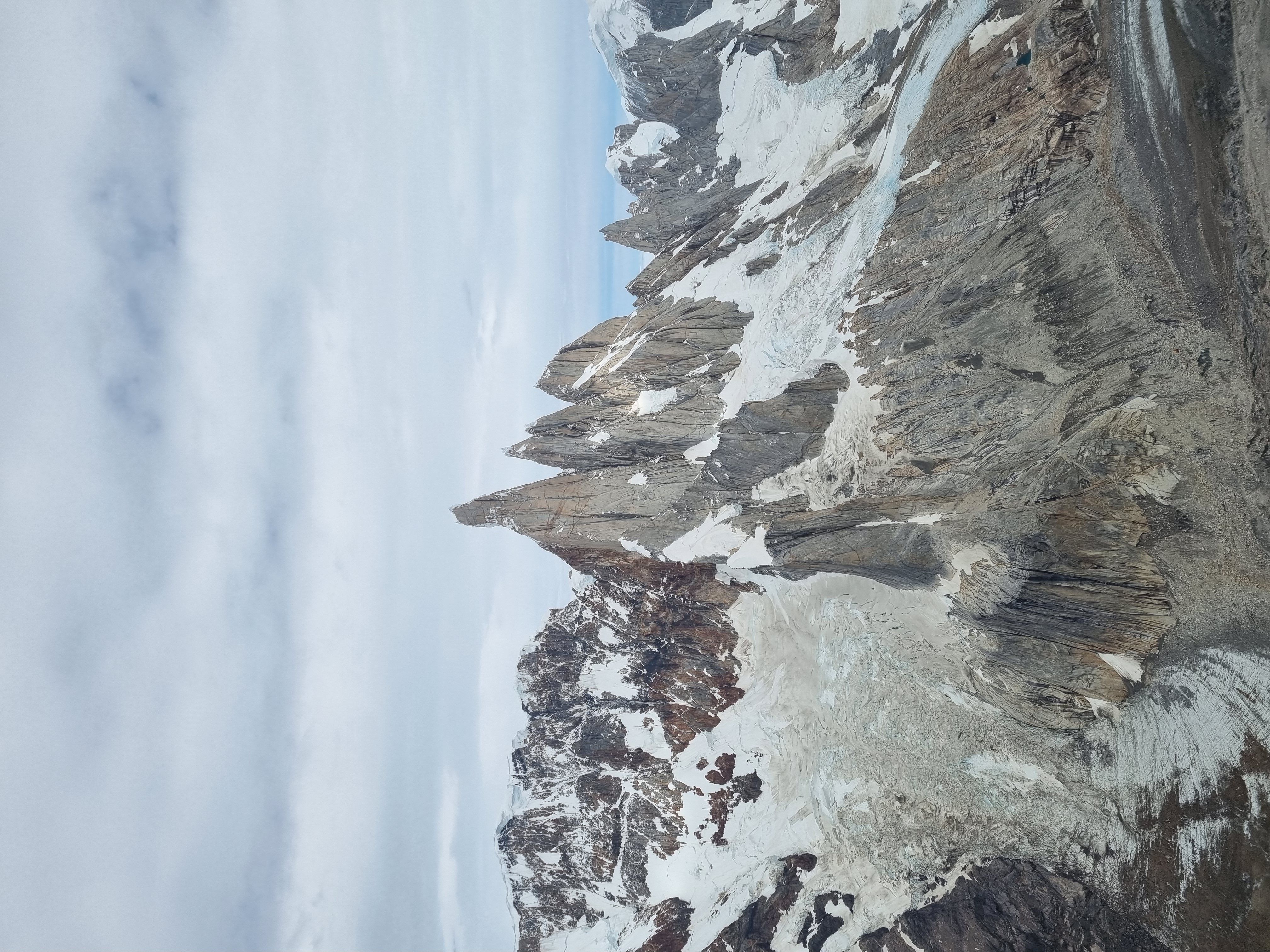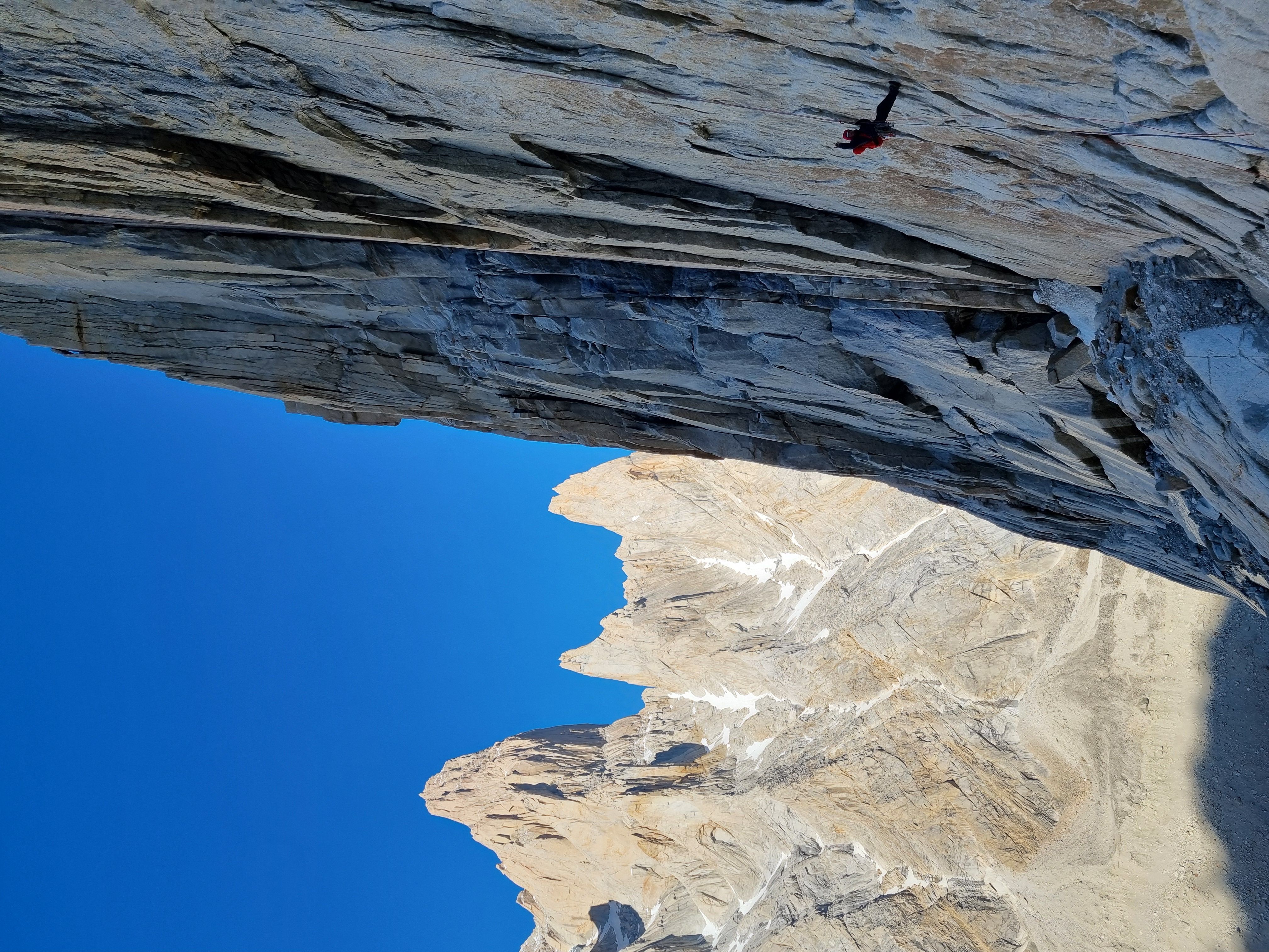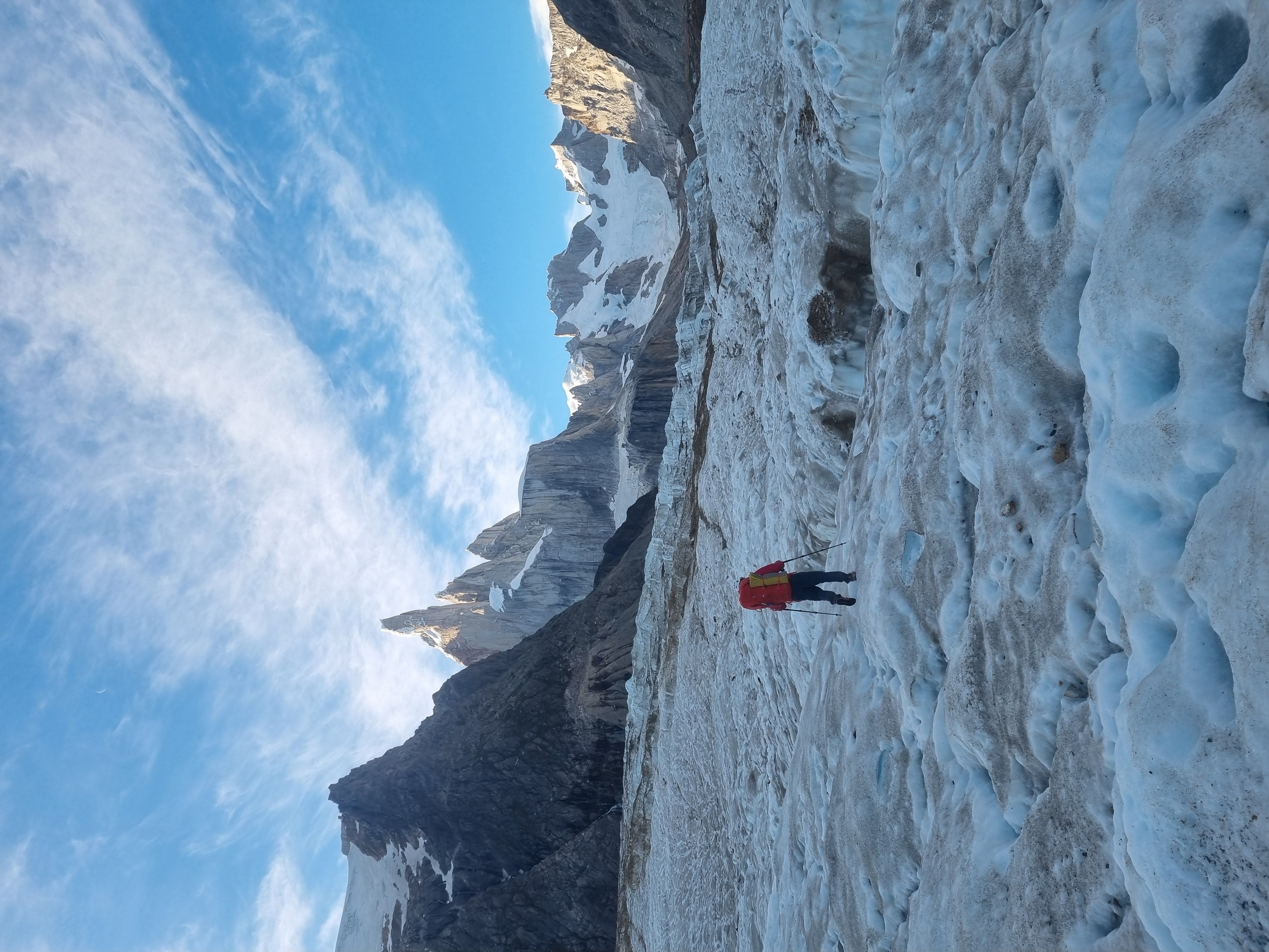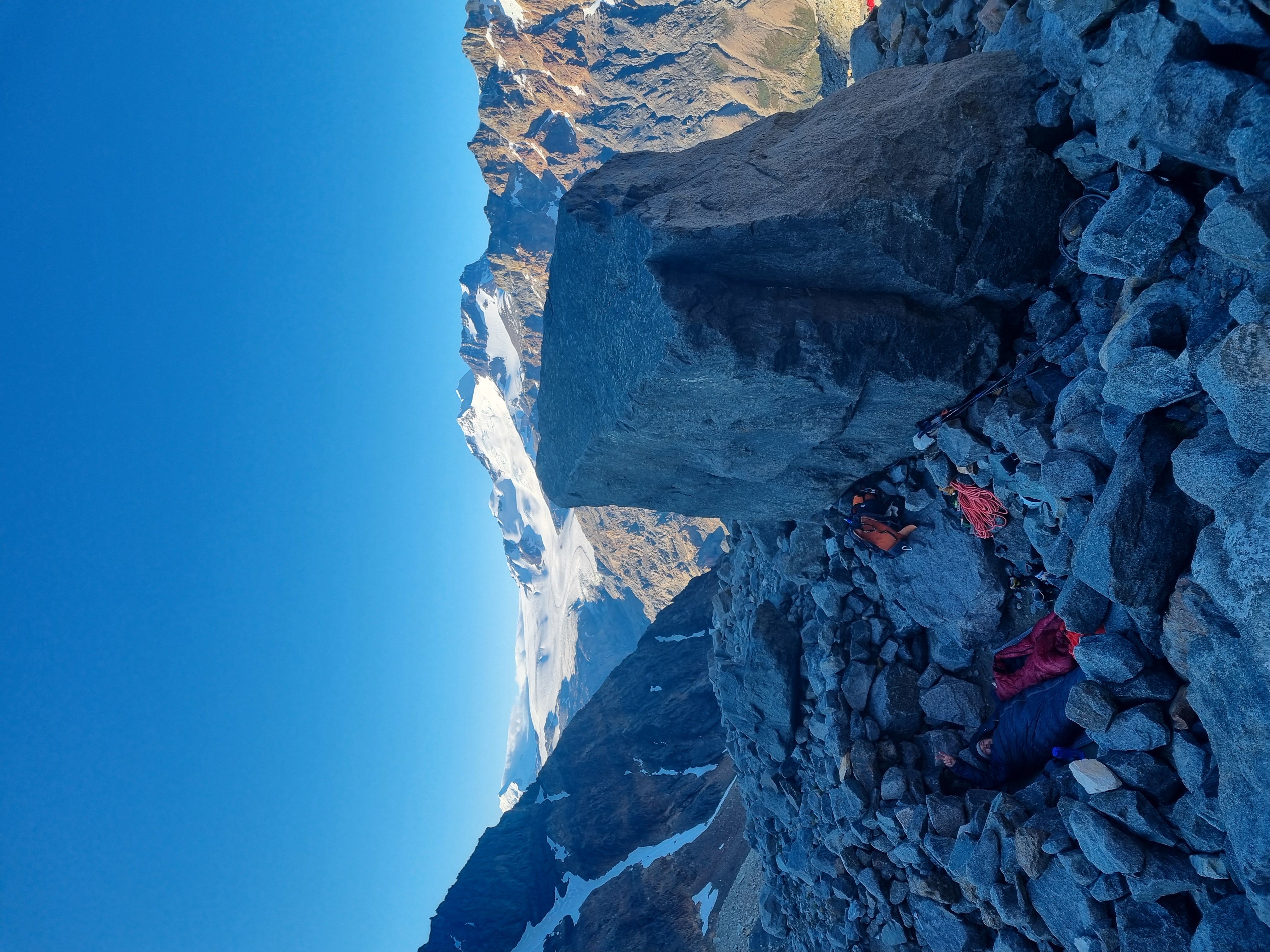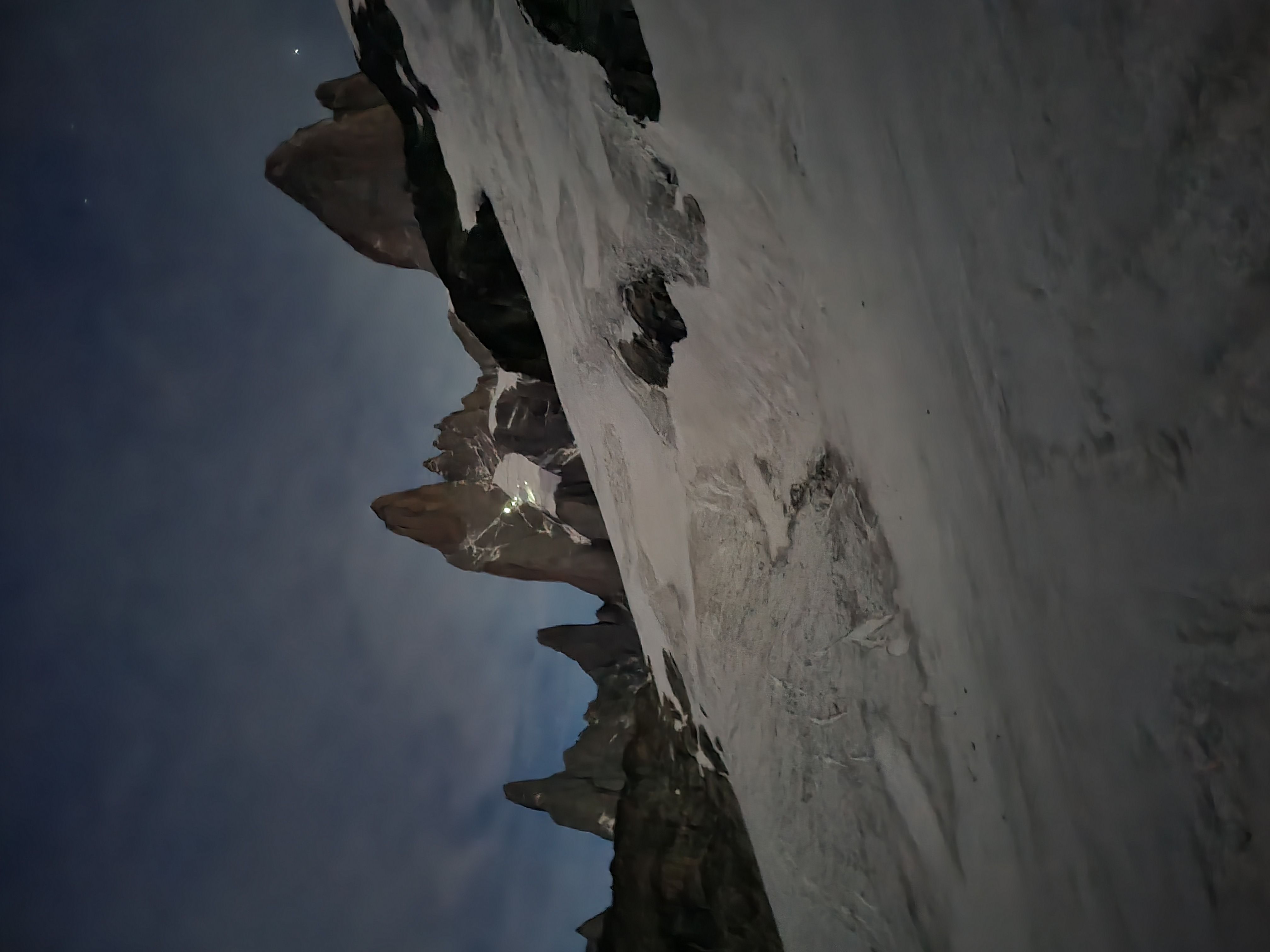 Vi racker opp med alle klÊrne pÄ, og Sondre gÄr i gang med Ä lede de fÞrste 3 t.l. lÞpende - med hansker og isÞks for Ä hakke is ut av sprekkene - og idet vi nÄr cruxtaulengden er fÞlelsen sÄ smÄtt kommet tilbake i fingre og tÊr. Jeg fÄr fÞrste stÞt opp kaminen, og kjemper meg forbi isglatte sprekker og snÞdekt stein, til jeg endelig fÄr pÄ dunisen pÄ stand - i le! Sondre kjÞrer videre opp neste t.l. nesten uavbrutt for Ä holde varmen mens jeg sosialiserer med noen nye standplassnaboer fra Tirol. Deretter fÞlger en luftig fingertravers med utsikt ned til breen under oss - sannsynligvis den kuleste taulengden jeg har ledet sÄ langt pÄ denne turen, ikke minst fordi det hele ble gjort med full alpinsekk pÄ ryggen - heftig!
