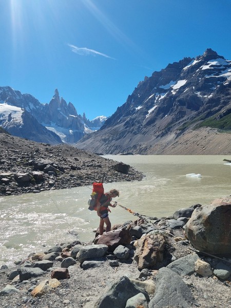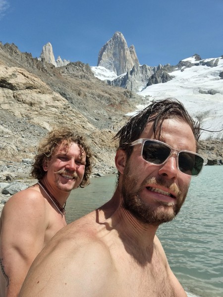 Vi blir sittende veldig lenge i sola, trygt nede fra breen, for det som ble siste gang i det alpine for oss for denne gang. Begge er vi enige om at vi har fÄtt god uttelling for turen, og at vi har lÊrt mye om oss selv og hverandre. For anledningens skyld lot jeg meg til og med overtale til Ä bade i brevannet, og Ä svÞmme blant isklumpene som duppet rundt. Takknemlig for at vi kom trygt ned (og for min skyld, opp av vannet) lunter vi ned igjen til El Chalten, denne underlige men utrolige byen midt ute i den argentinske Þdemarka.