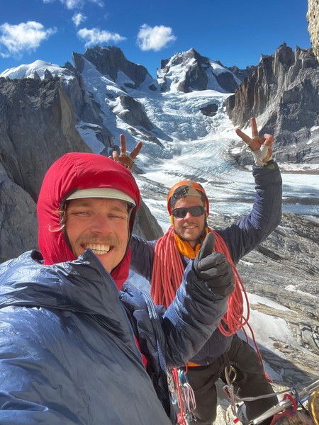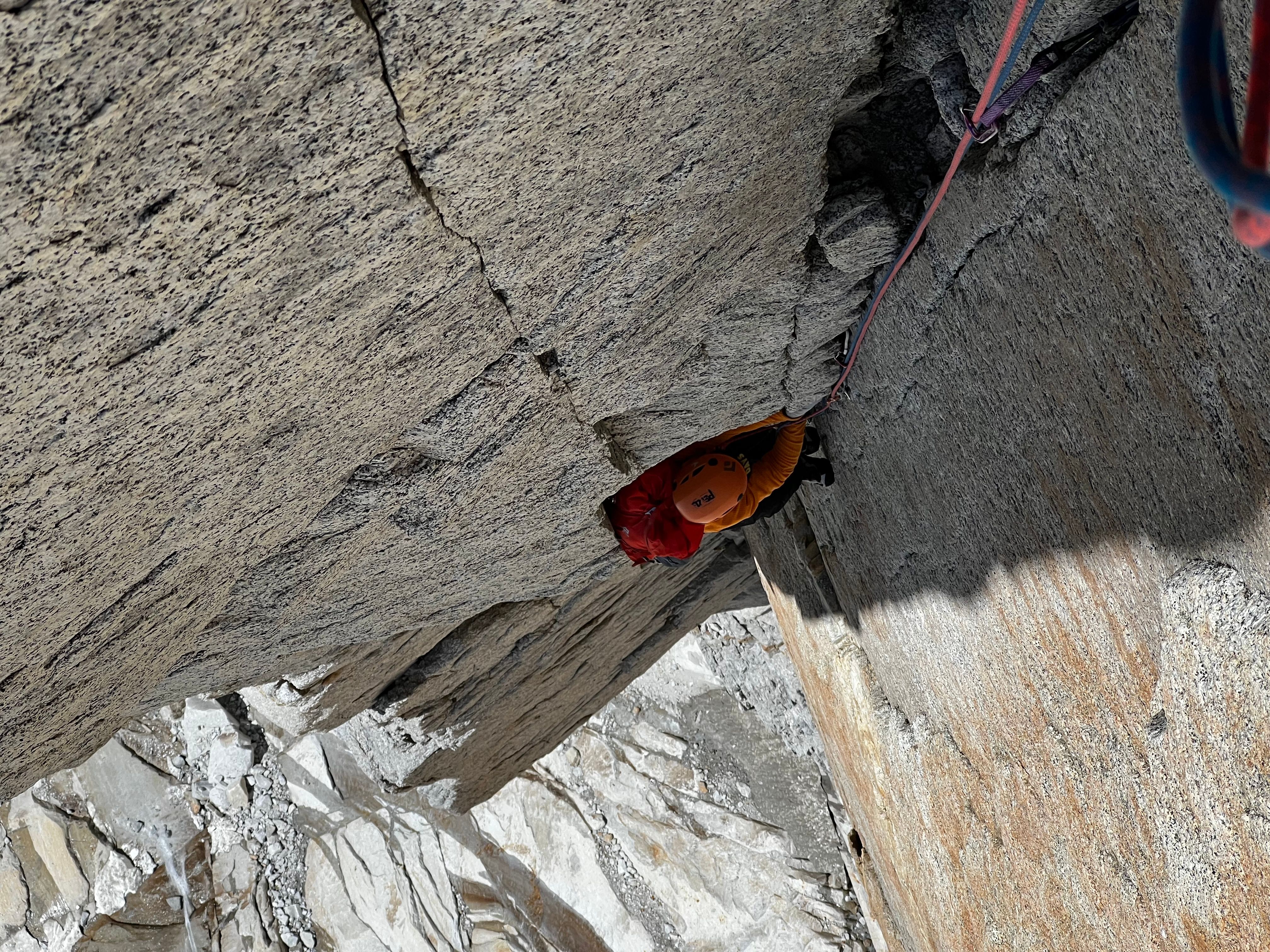 Sondre er skikkelig i slaget - muligvis er det skyggen av Cerro Torre som gir ham ekstra styrke - han flyr opp de fĂžrste 3 taulengdene lĂžpende, og jeg puster det slovenske taulaget i nakken pĂ„ vei opp til cruxet. Jeg er litt sliten etter den lange innmarsjen, sĂ„ jeg er glad nĂ„r Sondre melder seg til Ă„ lede. PĂ„ strak arm kjemper han seg igjennom et overhengende hjĂžrne med muligens den beste utsikten vi noensinne har klatret i. Etter det hĂžrer jeg noen anstrengte lyder mens Sondre kjemper seg videre opp sprekken, fĂžr endelig - “Standplass!”. NĂ„ er det ingen vei tilbake - den trĂžtte kroppen skal opp veggen. Jeg forbereder meg mentalt pĂ„ Ă„ kunne falle, men idet jeg begynner pĂ„ taket kommer endelig flyten tilbake. Jeg karrer meg opp til stand og uttrykker min ĂŠrefrykt til Sondre, som kvitterer: “Helt ĂŠrlig trodde jeg det ville bli et heng i tauet - men sĂ„ titta Cerro Torre frem bak skyene, og da var det som om pumpen forsvant fra armene.” Her mĂ„ jeg gi Sondre rett - det er altsĂ„ useriĂžst flott.