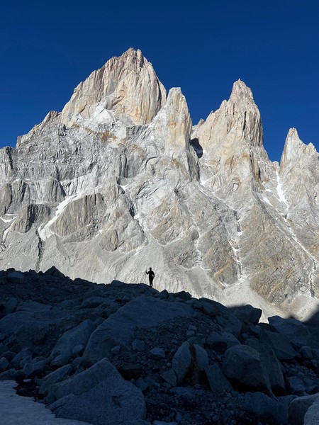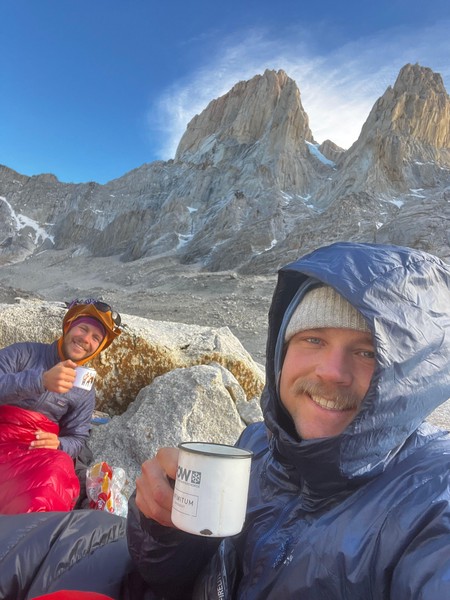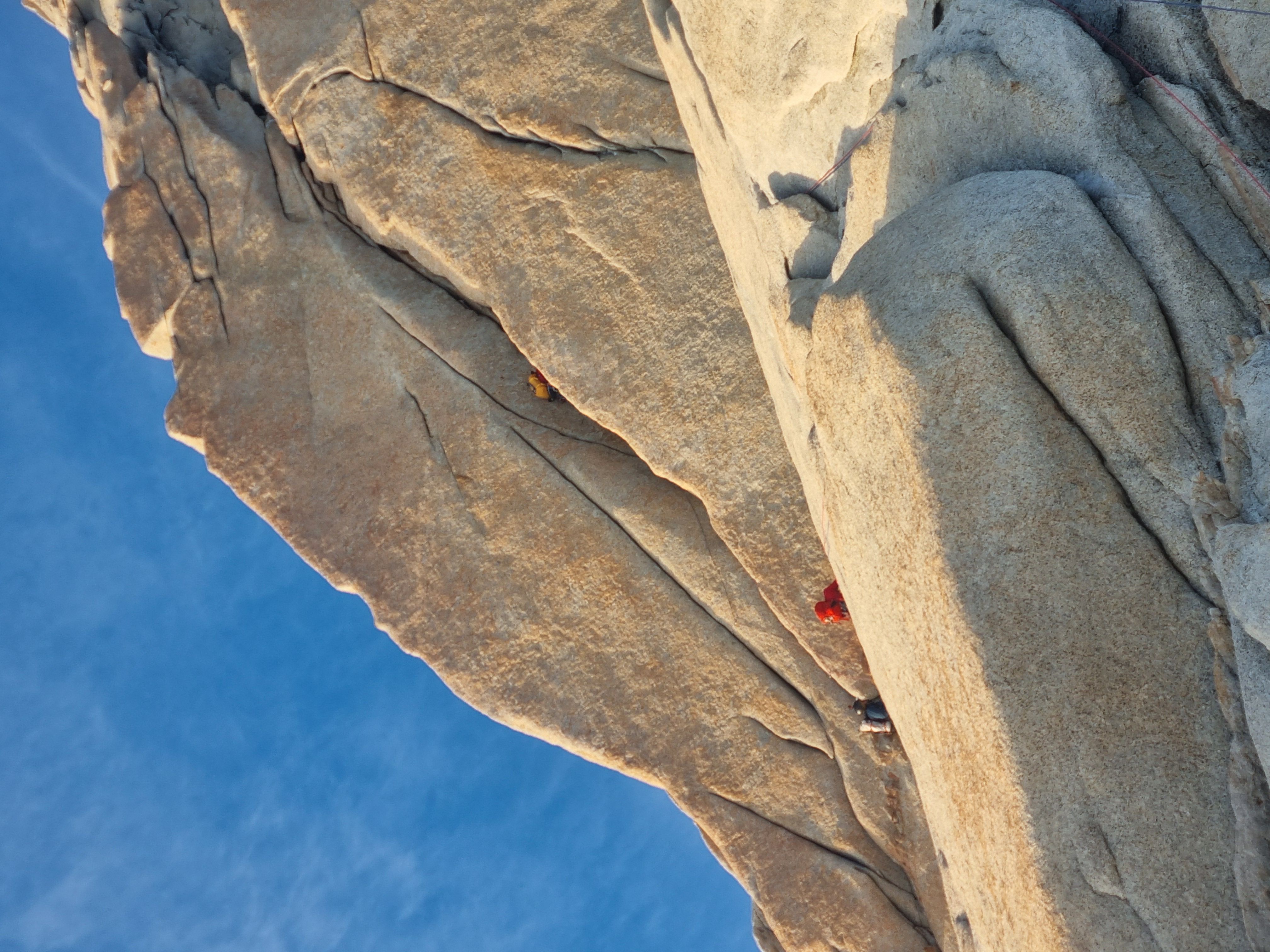 Morgengry pÄ Niponino er noe av det mest spektakulÊre jeg har opplevd. Fritt for dyre- og planteliv er dette golde landskapet ÞredÞvende stille mens jeg finner frem Jetboilen for Ä koke vann til kaffe og frokost. Kl 08 forlater vi camp, klarer Ä rote oss av stien og istedet blir nÞdt til Ä smÞre opp svaene i anmarsjsko. Ved innsteget ser vi et taulag pÄ 3 hÞyt oppe i veggen, men de er langt nok foran oss til at vi ikke tror det blir et problem. Vi racker opp og stasher sko pÄ bÄnn.